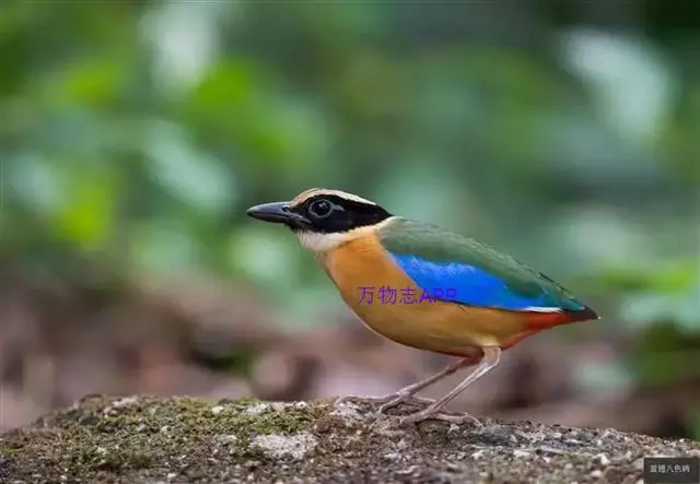 蓝翅八色鸫是雀形目八色鸫科的鸟类。体长17-20厘米,体重类约48-70克,体型圆胖,尾短,腿长,以身体具有红、绿、蓝、白、黑、黄、褐、栗等鲜艳夺目,丰富艳丽的色彩而得名,是很有观赏价值的鸟类。主要栖息于海拔200 米以下的平坝和丘陵落叶很厚的各种类型的树林中,也见于林缘溪流边的灌丛和小树上,田坝区的榕树和村寨边的小树上,以及竹林等环境。常在森林底层或低植被中找食无脊椎动物。叫声简单哀婉。主要以甲虫、白蚁、鳞翅目、鞘翅目的昆虫和蚯蚓、蜈蚣等小动物为食。分布于中国西南部、东南亚;越冬于马来半岛、苏门答腊及婆罗洲。