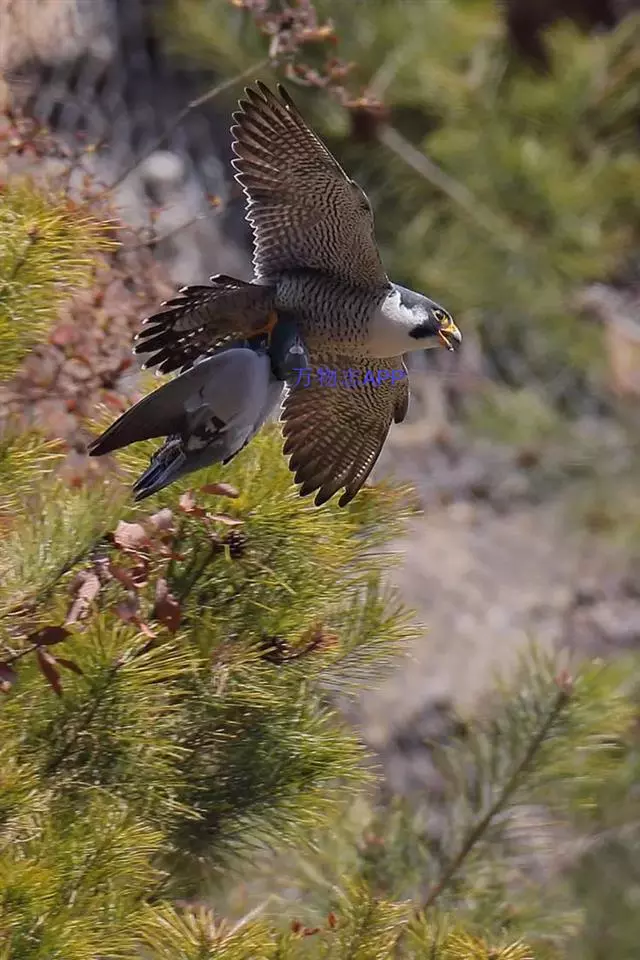 游隼yóu sǔn:是隼科、隼属的中型猛禽,共有18个亚种。体长41-50厘米。翅长而尖,眼周黄色,颊有一粗著的垂直向下的黑色髭纹,头至后颈灰黑色,其余上体蓝灰色,尾具数条黑色横带。主要栖息于山地、丘陵、半荒漠、沼泽与湖泊沿岸地带。分布遍布于世界各地。是阿拉伯联合酋长国,安哥拉的国鸟。列入《濒危野生动植物种国际贸易公约附录Ⅰ、附录Ⅱ和附录Ⅲ》2019年版附录Ⅱ。…