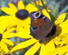 孔雀蛱蝶展翅宽50~60mm。翅膀表面红色,上、下翅有一大型彩色眼纹;翅膀腹面淡褐色,拟似烟熏枯叶…全部>>