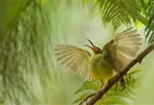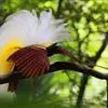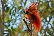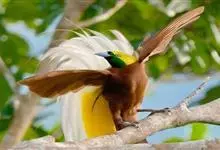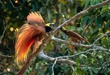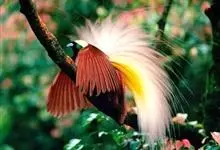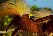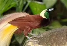 大极乐鸟是极乐鸟属中最大的鸟种。成年雄鸟体长可达到43厘米,雌性可达35厘米。雄鸟的额、颊、喉等墨绿色;头、颈黄色;上体暗赤栗色;腹部葡萄红色,胁部有长饰羽,其基部橙黄,中部黄色,…全部>>