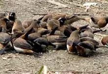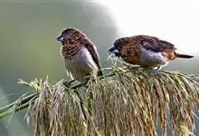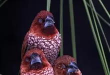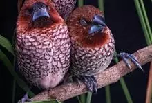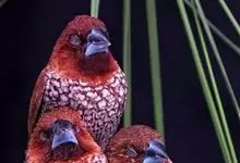 栗腹文鸟:小型鸟类,体长10-12厘米。嘴蓝灰色,基部粗厚,先端尖、呈圆锥状, 脚亦为蓝灰色,整个头、颈和上胸黑色,其余体羽栗色,或下胸和腹中央至尾下覆羽黑色。尾栗红色。全部>>