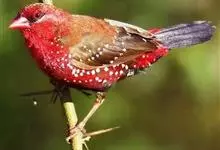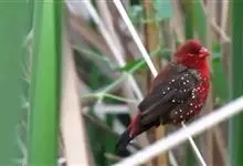 红梅花雀小型鸟类,体长9-10厘米。雄鸟通体朱红色,背、肩、胸等满布白色小斑点,两翅和尾黑褐色均具白色端斑,嘴红色,脚蜡黄色。雌鸟上体淡褐色或赭褐色,翅上中覆羽、大覆羽和内侧飞羽末端具白色斑点,…全部>>