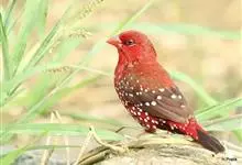 红梅花雀小型鸟类,体长9-10厘米。雄鸟通体朱红色,背、肩、胸等满布白色小斑点,两翅和尾黑褐色均具白色端斑,嘴红色,脚蜡黄色。雌鸟上体淡褐色或赭褐色,翅上中覆羽、大覆羽和内侧飞羽末端具白色斑点,…全部>>