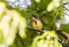 黄腹啄花鸟:体重11-16克,体长104-117毫米。是一种体型大,下腹部为艳黄色的啄花鸟,雄鸟特征为头黑色,喉部有白色纵斑、喉侧及上体成对比,两翅和尾黑色,外侧尾羽内翈具白色斑块。其余下体淡黄色。…全部>>
