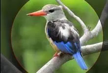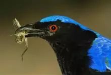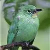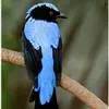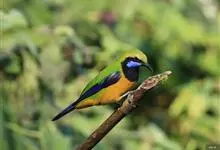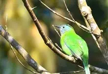 蓝翅叶鹎:小型鸟类,体长15-18厘米。雄鸟通体草绿色,尾蓝绿色,肩和翅亮蓝 色,胸缀有黄色,颏、喉黑色。雌鸟颏,喉蓝绿色。栖息在海拔1500米以下的常绿阔叶林、次生林和林缘疏林灌丛中。…全部>>