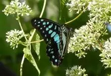 青带凤蝶Graphium sarpedon ,又名青凤蝶,是最普遍的中型凤蝶,飞行速度很快。青带凤蝶的翅膀中央有许多浅蓝色的斑点,很整齐地排列成一条直线。这些斑点由上而下逐渐变大,就像一条青色的带子。全部>>