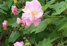 木芙蓉,锦葵科木槿属落叶灌木或小乔木。小枝上有细绒毛;叶片为卵状心形,托叶为披针形,常早落;花单生,花萼为钟形,花冠初为白色或淡红色,后逐渐变为深红色;果实为扁球形,有淡黄色的毛附着。花期8到10月。…全部>>