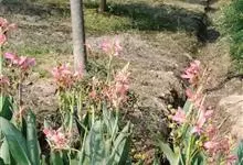 粉美人蕉:是一种球根草本植物。根茎延长,株高1.5-2米;茎绿色。叶片披针形;总状花序疏花,单生或分叉,稍高出叶上;苞片圆形,褐色,花黄色,无斑点;有多种园艺栽培品种,颜色从粉、橙红色及具带红色斑点…全部>>