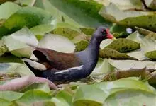 黑水鸡:是鹤形目、秧鸡科的鸟类,共有12个亚种。中型涉禽,体长24-35厘米。嘴长度适中,鼻孔狭长;头具额甲,后缘圆钝;嘴和额甲色彩鲜艳。翅圆形,第2枚初级飞羽最长,或第2枚和第3枚初级飞羽等长,…全部>>