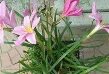 小韭兰学名韭菜莲又名风雨花、菖蒲莲、红玉帘和旱水仙,多年生草本,鳞茎卵球形,基生叶常数枚簇生,线形,扁平,花单生于花茎顶端,下有佛焰苞状总苞,花玫瑰红色或粉红色,蒴果近球形,种子黑色,花期夏秋。韭莲…全部>>