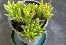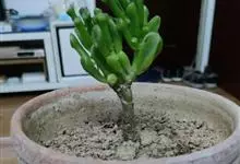 筒叶花月,是景天科青锁龙属的多年生草本植物。植株多分株,灌木状,茎较粗壮,圆柱形,表皮灰褐色;叶片肉质,互生,呈圆筒状,簇生于茎或分枝顶端,叶端呈斜截形,截面为椭圆形;花呈星状,淡白色;花期秋季。…全部>>