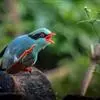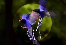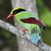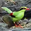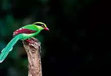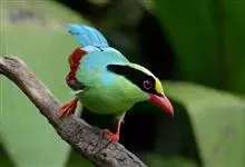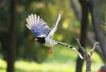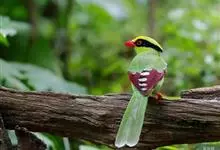 蓝绿鹊:中型鸟类,共有5个亚种。体长36-38厘米。尾长,嘴、脚红色。通体羽色主要为草绿色,宽阔的黑色贯眼纹向后延伸到后颈,在绿色的头侧极为醒目。两翅栗红色,内侧飞羽具黑色次端斑和白色尖端。尾绿色,…全部>>