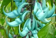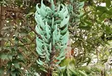 翡翠葛是豆科翡翠葛属植物,多年生常绿大型藤本,茎木质,直径可达30厘米,长可达21.3米。三出复叶,革质光亮,小叶长椭圆形,长7.6-12.7厘米,中间小叶最长。花两性,春季至初夏开花,蓝绿色,…全部>>