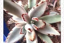 褐斑伽蓝是景天科伽蓝菜属的多年生多肉类植物,茎直立,多分枝,叶生于枝上,肉质叶片匙形,上面密被白色绒毛,下部全缘,叶缘上部有缺刻,缺刻处有深褐或棕色斑块。褐斑伽蓝原产非洲的马达加斯加岛。…全部>>