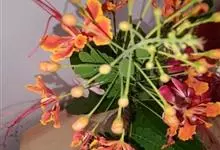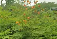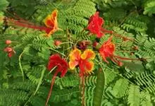 洋金凤 Sw.),豆科小凤花属灌木状或小乔木植物,枝无毛,绿或粉绿色;二回羽状复叶;总状花序伞房状,萼片无毛,花瓣橙红或黄色,圆形,花丝红色,子房无毛,花柱橙黄色;荚果窄而薄,…全部>>