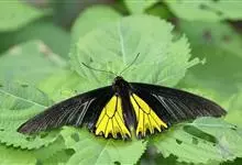 金裳凤蝶是凤蝶科、裳凤蝶属的动物。金裳凤蝶身体呈黑色,头、颈和胸侧有红毛,腹部有黑黄两色相间条纹,雄蝶前翅黑色,具黑天鹅绒光泽,各脉两侧灰白色,后翅金黄色,各室外缘有等腰三角形黑斑1枚,斑内侧有晕,…全部>>