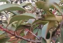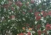 石楠 Kalkman),是蔷薇科石楠属的常绿乔木,高5~12米,株型紧凑,树冠圆球形。树枝为褐灰色;鳞片为褐色,没有毛;叶片革质,长椭圆至侧卵状椭圆形,有锯齿,新叶红色光亮。复伞房花序,白色小花,…全部>>