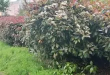 石楠 Kalkman),是蔷薇科石楠属的常绿乔木,高5~12米,株型紧凑,树冠圆球形。树枝为褐灰色;鳞片为褐色,没有毛;叶片革质,长椭圆至侧卵状椭圆形,有锯齿,新叶红色光亮。复伞房花序,白色小花,…全部>>