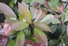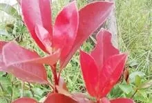红叶石楠 是蔷薇科,石楠属杂交种,为常绿小乔木或灌木,乔木高可达5米、灌木高可达2米。叶片革质,长圆形至倒卵状、披针形,叶端渐尖,叶基楔形,叶缘有带腺的锯齿,花多而密,复伞房花序,花白色,梨果黄红色,…全部>>