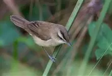 黑眉苇莺:体重7-11克,体长11-13厘米。上体橄榄棕褐色;眉纹淡黄色,杂有明显黑褐色纵纹;第2枚初级飞羽较第6枚短;下体白色,两胁暗棕色。虹膜暗褐色;嘴黑褐色,下嘴基淡褐色;脚暗褐色。…全部>>
