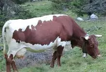 西门塔尔牛是偶蹄目牛科牛属哺乳动物。 体躯长,呈圆筒状,肌肉丰满;头较长,面宽,颈长中等,角较细而向外上方弯曲,尖端稍向上;前躯较后躯发育好,胸深,尻宽平,四肢结实,大腿肌肉发达,乳房发育好。…全部>>