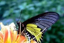 金裳凤蝶是凤蝶科、裳凤蝶属的动物。金裳凤蝶身体呈黑色,头、颈和胸侧有红毛,腹部有黑黄两色相间条纹,雄蝶前翅黑色,具黑天鹅绒光泽,各脉两侧灰白色,后翅金黄色,各室外缘有等腰三角形黑斑1枚,斑内侧有晕,…全部>>