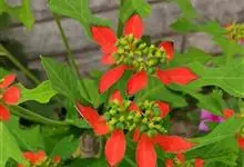 猩猩草:常绿或半常绿灌木,盆栽时株高0.5米-2米,在亚热带地区可长到6米以上。茎直立而光滑,单叶互生,卵状椭圆形至阔披针形,具不规则的深缺刻。长10-15厘米。花小,有蜜腺,排列成密集的伞房花序。…全部>>
