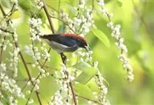 朱背啄花鸟:体重6-8克,体长81-97毫米。是一种小型的黑色及红色啄花鸟。雄鸟顶冠、背及腰猩红色,两翼、头侧及尾黑,两胁灰,下体余部白色。雌鸟上体橄榄色,腰及尾上覆羽猩红,尾黑。亚成鸟清灰色,嘴橘黄,…全部>>