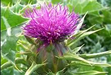 水飞蓟 Gaertn.),又名水飞雉、奶蓟、老鼠筋、乳蓟子,是菊科水飞蓟属的一种一年生或二年生草本植物。株高1.2m。茎直立有棱,多分枝,光滑或被蛛丝状毛。叶互生,莲座状基生叶常平铺地面,…全部>>