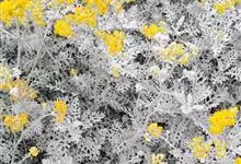 银叶菊,是菊科疆千里光属多年生草本植物。银叶菊的茎灰白色,植株多分枝;叶回羽状裂,正反面均被银白色柔毛;头状花序集成伞房花序,舌状花小,金黄色,管状花褐黄色;花期为6-9月。银叶菊原产于地中海沿岸地区,…全部>>