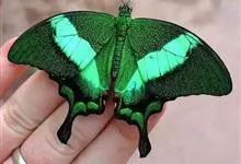 巴黎翠凤蝶中型凤蝶,躯体黑褐色,散布绿色亮鳞。后翅M3脉端有一明显叶状尾突。翅背面底色黑褐色,密布亮鳞,后翅前侧有一枚蓝绿色亮斑,与后翅中央之绿色亮线连接。后翅臀区有一紫红色圈纹。翅腹面底色褐色,于…全部>>