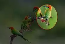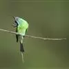 栗喉蜂虎是蜂虎科蜂虎属的鸟类。有热带鸟类羽毛艳丽的特征:喉部是栗红色的,黑色的过眼纹,翅膀和背部是绿色的,尾翼是蓝色的,飞行时翅膀下面的羽毛是橙黄色的,在阳光的照射下,它们全身闪烁着金属般的艳丽光泽,…全部>>