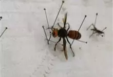 虎头蜂,又名黄脚胡蜂、黄马蜂,是膜翅目胡蜂科胡蜂属昆虫。虎头蜂前胸背板侧面具横皱,后足胫节长刚毛稀少,颅顶黑色或黄褐色,腹部第4背板端部常有1条宽黄带,腹部末端有螫针,连接着毒腺。因为头大得像老虎,…全部>>