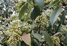石楠 Kalkman),是蔷薇科石楠属的常绿乔木,高5~12米,株型紧凑,树冠圆球形。树枝为褐灰色;鳞片为褐色,没有毛;叶片革质,长椭圆至侧卵状椭圆形,有锯齿,新叶红色光亮。复伞房花序,白色小花,…全部>>