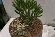 筒叶花月,是景天科青锁龙属的多年生草本植物。植株多分株,灌木状,茎较粗壮,圆柱形,表皮灰褐色;叶片肉质,互生,呈圆筒状,簇生于茎或分枝顶端,叶端呈斜截形,截面为椭圆形;花呈星状,淡白色;花期秋季。…全部>>