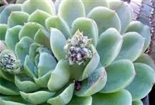 蓝石莲是景天科、拟石莲花属的多肉植物。茎部粗壮,成熟植株茎部木质化。叶片莲座型密集排列,株径不会很大,叶片相对较薄,常年绿色,表面布有白色粉末,中部凹陷,呈倒水滴状。叶尖较尖,叶缘光滑无褶皱,…全部>>