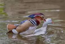 鸳鸯是鸭科鸳鸯属动物。鸳鸯体长约44.5厘米 ;头、背呈灰褐色;颊、嘴基、喉白色,上体余部橄榄褐色,尾部转暗褐色;胸侧与两胁棕褐色;腹部与尾下覆羽白色;雌雄异色。鸳鸯又名匹鸟;因其雌雄不分离,…全部>>