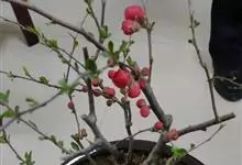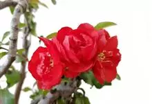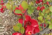 贴梗海棠Nakai)是蔷薇科、木瓜海棠属植物。落叶灌木,高达2米,枝条直立开展,有刺。叶片卵形至椭圆形,稀长椭圆形,长3-9厘米,宽1.5-5厘米。花先叶开放,3-5朵簇生于二年生老枝上。…全部>>