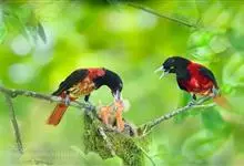 朱鹂:中等鸟类,体长23-28厘米。雄鸟绛紫红色,头、上胸及翼黑色。雌鸟上背及背部深灰色,尾覆羽及尾绛紫红色,腹部及下胸白而密布黑色纵纹。与鹊色鹂幼鸟的区别在上背灰色较深,下体白色较少且纵纹较粗。…全部>>