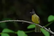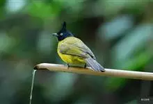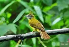 黑冠黄鹎:体长18-21厘米,是一种中等体型偏黄色鹎。整个头、颈、颏、喉黑色,头顶有显著直立的羽冠,黑色,上体褐橄榄黄绿色,下体橄榄黄色。虹膜偏红;嘴及脚黑色。…全部>>