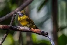 黄腹冠鹎:体长19-24厘米,是一种体型略大的褐色鹎。头顶橄榄褐色具黑褐色羽冠。白色的喉膨起,下体黄色。似白喉冠鹎但较鲜亮,上体褐色较重,腹部为鲜亮的柠檬黄色。虹膜褐色;嘴黑色;脚粉红色。…全部>>