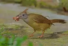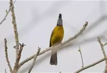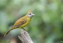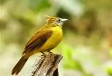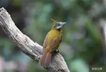 黄腹冠鹎:体长19-24厘米,是一种体型略大的褐色鹎。头顶橄榄褐色具黑褐色羽冠。白色的喉膨起,下体黄色。似白喉冠鹎但较鲜亮,上体褐色较重,腹部为鲜亮的柠檬黄色。虹膜褐色;嘴黑色;脚粉红色。…全部>>