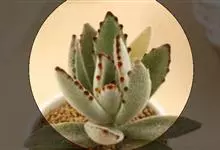 褐斑伽蓝是景天科伽蓝菜属的多年生多肉类植物,茎直立,多分枝,叶生于枝上,肉质叶片匙形,上面密被白色绒毛,下部全缘,叶缘上部有缺刻,缺刻处有深褐或棕色斑块。褐斑伽蓝原产非洲的马达加斯加岛。…全部>>