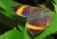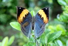 枯叶蛱蝶,又名木叶蝶、树叶蝶等,属于蛱蝶科。翅正面黑褐色,具深蓝色光泽,前翅顶角尖出,顶区有1枚小白点,中部有1条倾斜的橙色斑带,从前缘延伸至Cu室外缘,u室中部有1枚黑色圆斑,…全部>>