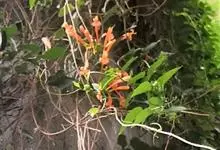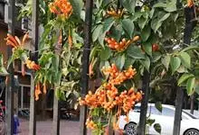 炮仗藤 Miers)紫葳科炮仗藤属藤本植物。小枝顶端有丝状卷须;叶对生,卵形;花萼钟状,橙红色,长椭圆形,花丝丝状,花药叉开;果瓣为革质,舟状。花期1-6月。初夏红橙色的花朵累累成串,状如鞭炮,…全部>>