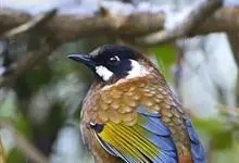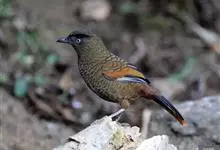 黑顶噪鹛:中型鸟类,体长24-26厘米。前额、脸、颏、喉黑色,头顶黑褐沾棕或深棕橄榄褐色,背栗褐或棕褐色,颧斑白色或棕红色,眼后缘和颈侧亦具白斑,飞羽金黄橄榄色而具蓝灰色尖端。下体淡棕褐色。…全部>>