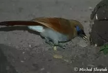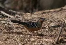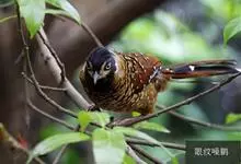 大噪鹛:中型鸟类,体长32-36厘米。额至头顶黑褐色,背栗褐色满杂以白色斑点,斑点前缘或四周还围有黑色。初级覆羽、大覆羽和初级飞羽具白色端斑。尾特长,均具黑色亚端斑和白色端斑。颏、喉棕褐色,…全部>>