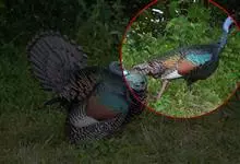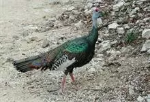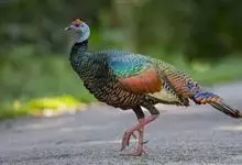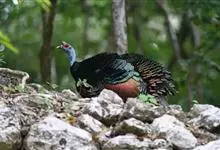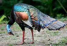 眼斑吐绶鸡:是火鸡科的两种鸟类之一。体型比普通火鸡略小些,体长1米左右,体重2.4-5.4千克,雄性比雌性略大,长得很特别,蓝色的秃脑袋上冒出几个橙黄色的疙瘩。但是它羽色艳丽,身体呈铜色及绿色。…全部>>