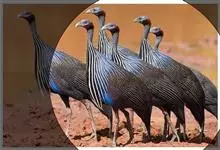鹫珠鸡:是珠鸡科中体形最大的一种,因头颈部像兀鹫而得名。雌雄羽色相似,为黑色基底上遍布白色点斑,如同珍珠。以各种植物的种子和小型动物为食。走禽。体结实,喙短,呈圆锥形,适于啄食植物种子;脚强健,具锐爪,…全部>>
