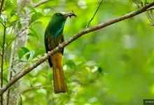 蓝须夜蜂虎是佛法僧目、蜂虎科的鸟类,体长约30厘米,是绿色林栖型蜂虎,蓝色的胸羽蓬松,嘴厚重而下弯。成鸟顶冠淡蓝,腹部棕黄带绿色纵纹。尾羽腹面黄褐。亚成鸟全身绿色。喉、胸部中央的羽甚长和亮色;该物种…全部>>